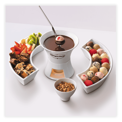 하겐다즈 아이스크림, 신선한 계절 과일, 그리고 패스트리에 따뜻한 벨지안 초콜릿 소스를 곁들여 먹는 디저트.
