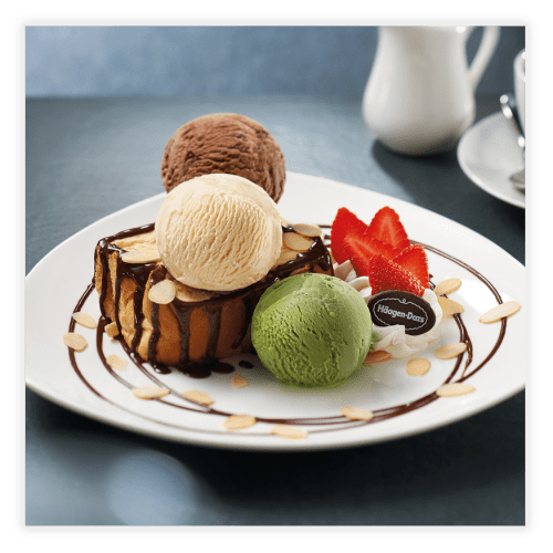 따뜻하게 구워낸 달콤한 허니브레드에 하겐다즈 베스트 플레이버인 그린티, 벨지안 초콜릿, 바닐라 아이스크림을 얹어 함께 즐기는 메뉴